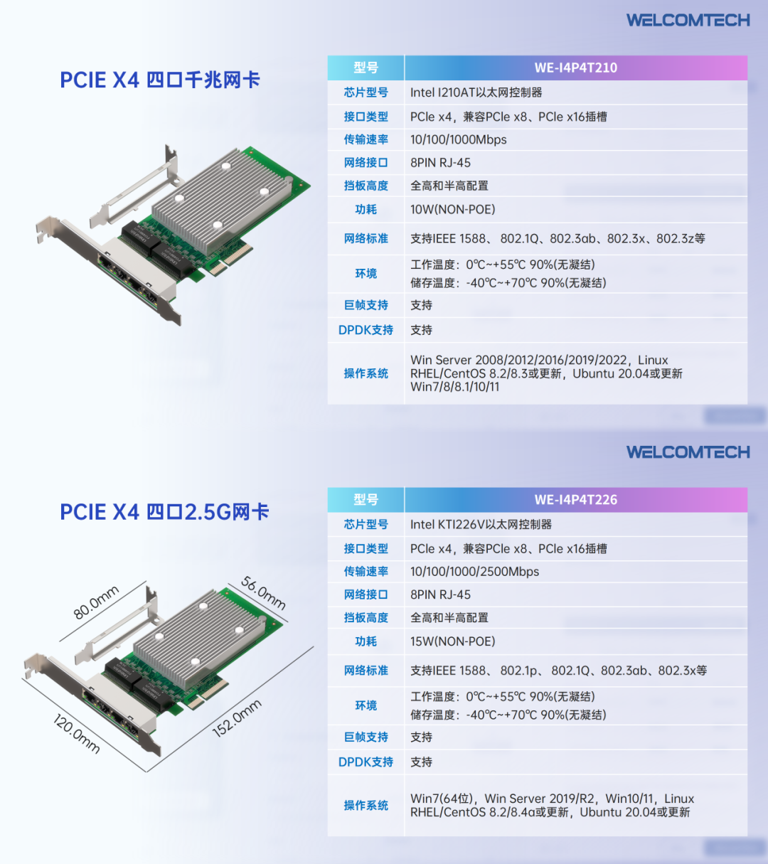 WE-I4P4T226是基于Intel I226芯片方案的基礎上自主研發的2.5G四口網卡,WE-I4P4T210是基于Intel I210芯片方案的基礎上自主研發的千兆四口網卡,擁有傳輸高效/穩定穩定的性能,能夠滿足工業自動化、機器視覺和服務器領域需求更多端口的用戶較為理想的部署方案。