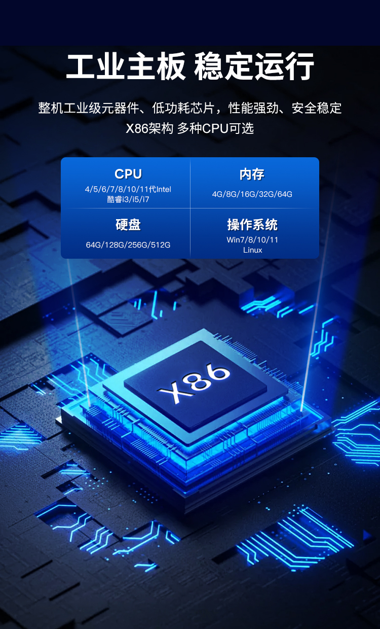 · 擁有豐富的I/O接口,1*LAN(可選配雙網)、2*USB3.0、2*USB2.0、6*擴展口(可擴展COM、USB等)